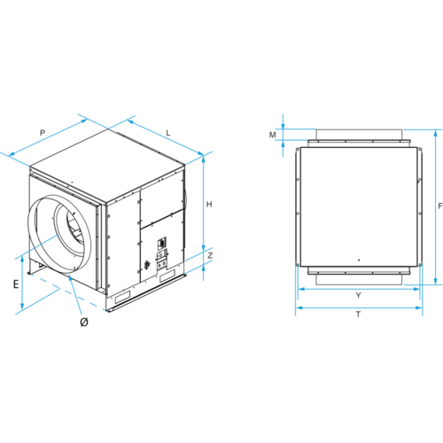 | Références | E (mm) | F (mm) | H (mm) | L (mm) | M (mm) | O (mm) | P (mm) | T (mm) | Y (mm) | Z (mm) | Ø (mm) | Poids (kg) |